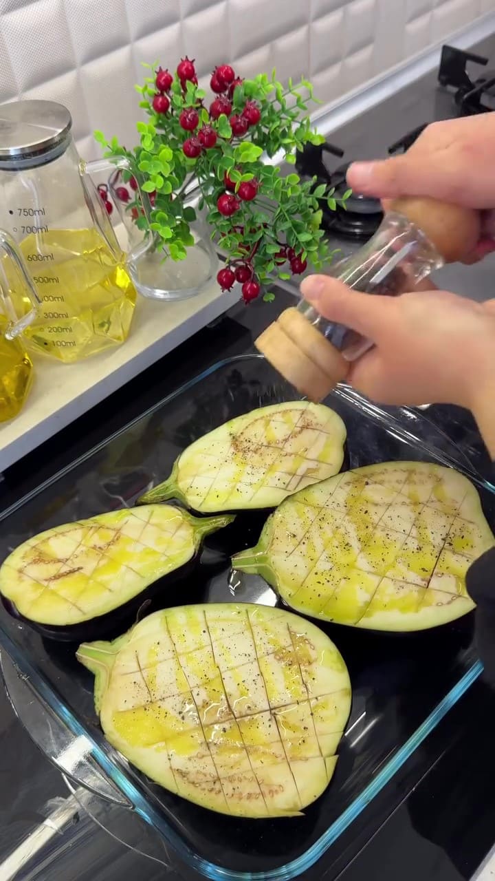- Drizzle the eggplants with olive oil and season with salt and pepper. Place on a baking sheet and bake at 180°C (350°F) until the flesh is soft and golden brown.