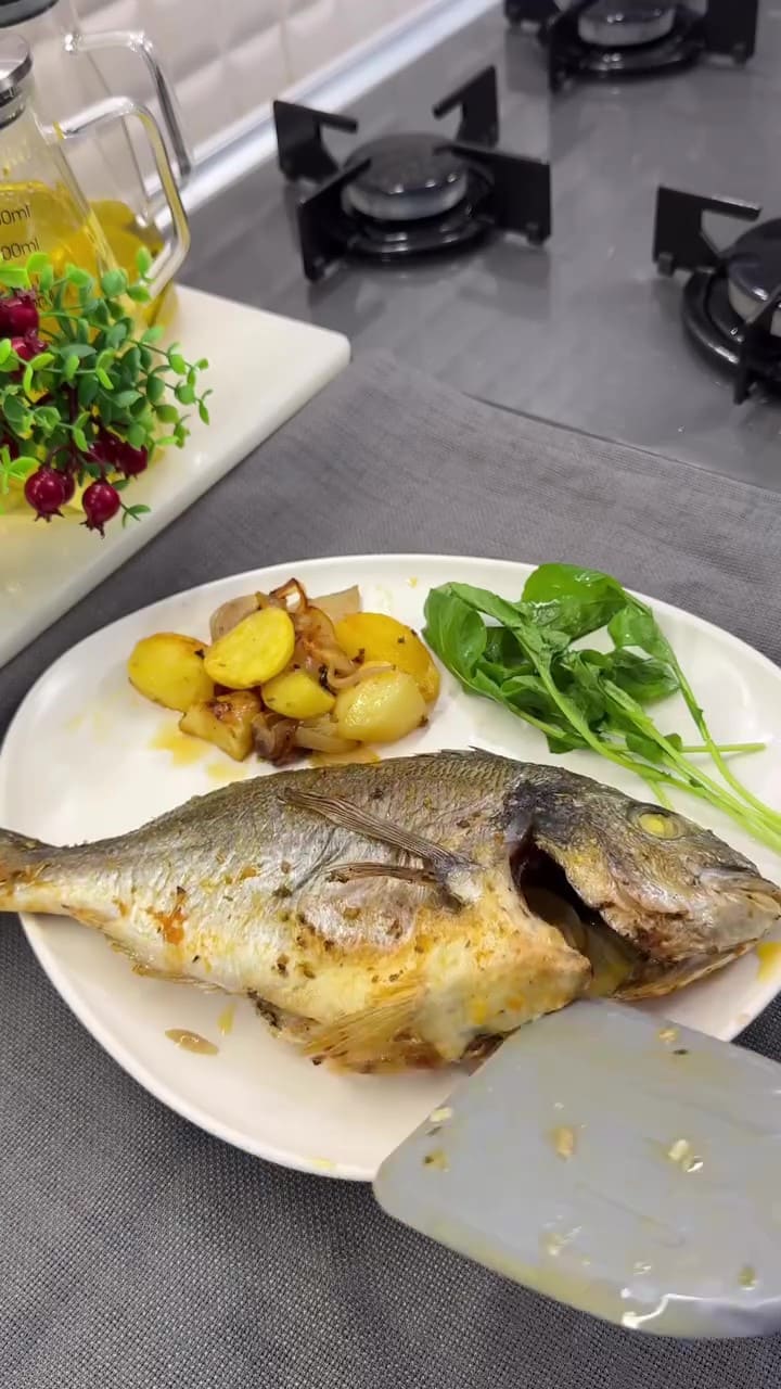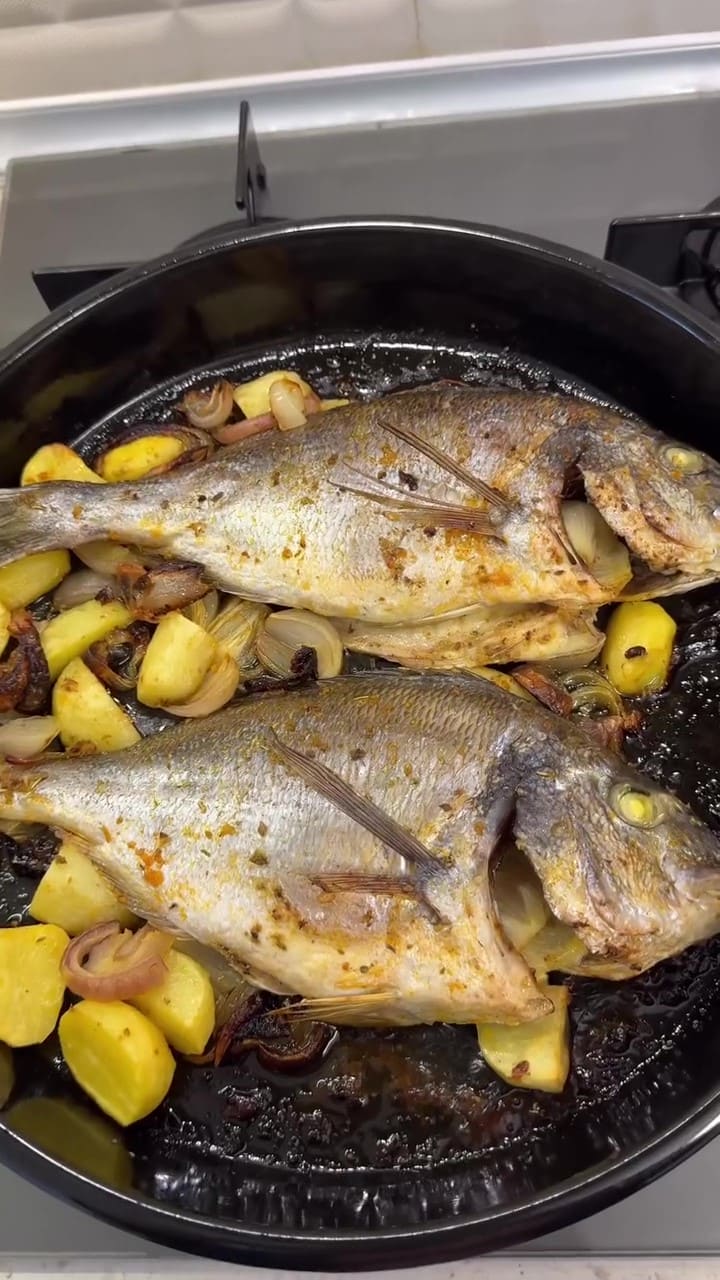 The final result of perfectly roasted, golden-brown and crispy sea bream with baby potatoes.