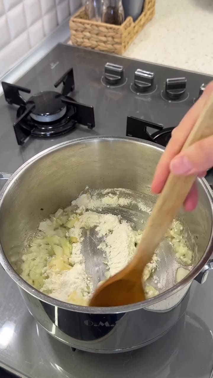 2. Add the flour to the onions. Stir constantly for 1-2 minutes until the flour smells nutty but hasn't changed color.