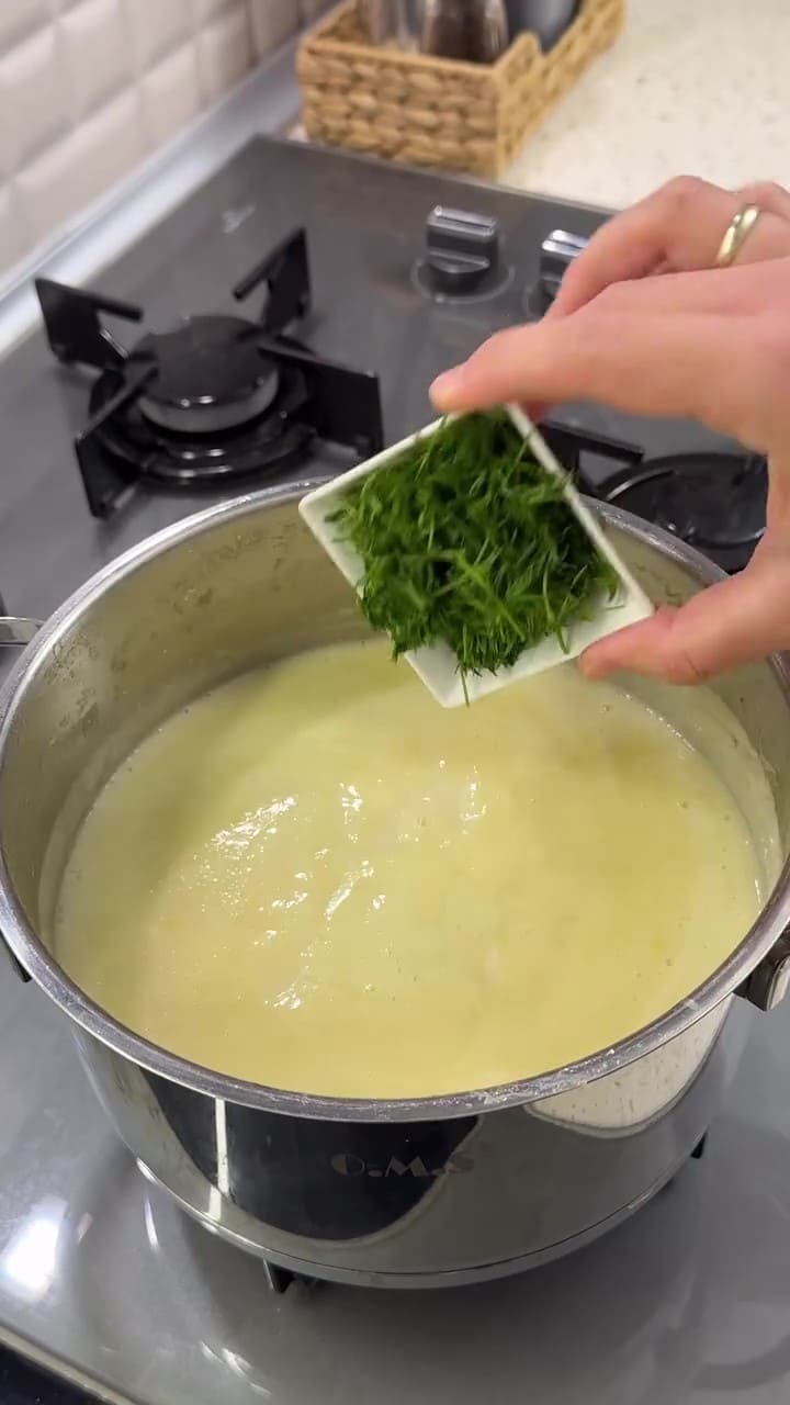 7. Add the finely chopped dill and salt. Let it simmer for another 2 minutes, then turn off the heat.