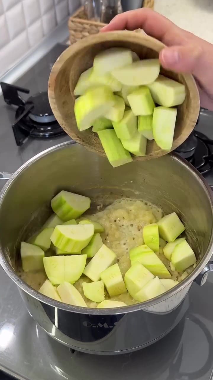 4. Pour in 1 liter of water (or stock). Bring to a boil, then reduce heat and simmer until the zucchini pieces are completely soft.
